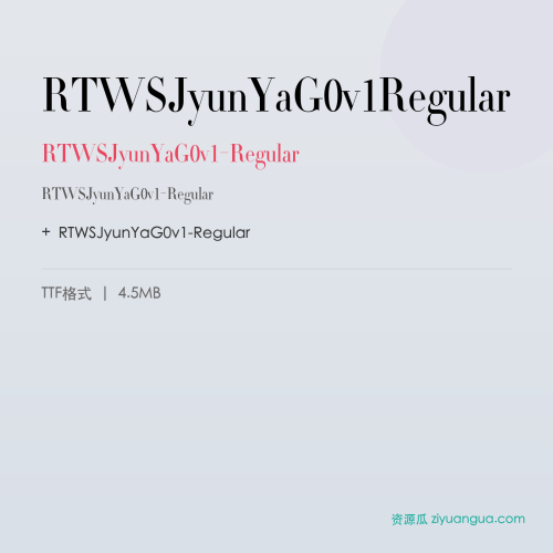 RTWSJyunYaG0v1-Regular是一款优秀的设计字体。RTWSJyunYaG0v1-Regular,笔画风格独特,适合多种设计场景使用。