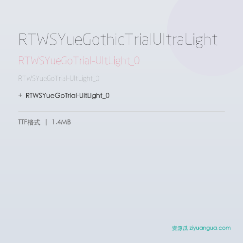 RTWSYueGoTrial-UltLight_0是一款线条纤细优雅,圆润可爱的中文字体。该字体在保持良好可读性的同时,兼具设计美感,是设计师字库中值得收藏的精品。